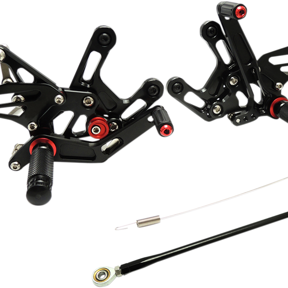 Caracteristicas: CNC machined from aircraft grade T6 6061 billet aluminum Fully adjustable to suit your riding style Mounting bracket and brake light switch spring included Supports OEM brake light switch Fully assembled and easy to install Knurled foot pegs with plastic caps Most applications can be converted to GP shift Complete kit - no additional parts required Ships fully assembled