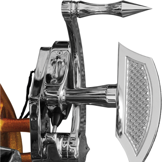 Caracteristicas: CNC-machined from 6061 billet aluminum Fit most forward controls and universal mounting Rigid mounting with 3/8"-16 mounting bolt Allow more foot movement compared to conventional footpegs Reverse-cut design with diamond-cut raised center for increased traction May be used as passenger foot boards if custom mounted Made in the U.S.A.