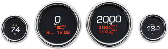 Caracteristicas: Four-gauge kit includes adjustable speedometer with odometer, tachometer, oil temperature (sensor included) and voltage gauges Displays clock and gear position; calculate 0-60 time, 1/4-mile time, 1/4-mile speed; feature high-speed and high-rpm recall Also includes a pair of 2-1/16” fully programmable gauges that can display oil pressure, oil temperature (sensor included), voltage and fuel level readings Includes 3-3/8” speedometer with odometer, dual trip meters and tachometer Direct plug-in four-gauge digital instrumentation system High-visibility LED display is easy to read, even in direct sunlight Small gauges can be programmed for the rider’s ideal layout 31 illumination colors available