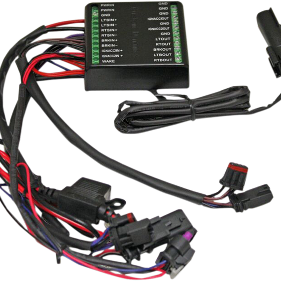 Caracteristicas: Allows you to connect aftermarket electrical and lighting accessories with total confidence Completely isolates the accessories from the vehicle’s main wire-harness without adding any additional load to the system A must-have on newer BCM/VCM/CAN bikes that have very sensitive electrical systems that do not allow the addition of electrical or lighting accessories Has an built in integrator function which combines brake and turn onto one wire, giving turn priority over brake which is very useful for adding Run-Brake-Turn function to a 3 wire LED (low-high-ground) There is also a built in trailer out which can be connected to an optional 4 pin trailer harness (sold separately) given you complete and total confidence of a 100% isolated trailer connector from the vehicle Total Isolation of all lighting and electrical accessories from vehicle Left Turn, Right Turn, Brake, Battery, Accessory Power Inputs Isolated Outputs: Left Turn, Right Turn, Brake, Run/Accessory Isolated Integrated Output: Turn/Brake Output Plug and Play (except for universal version) 45 Amp Max Total Capacity