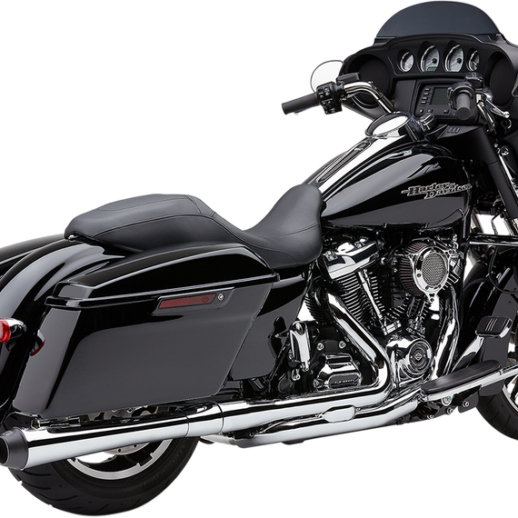 Caracteristicas: These have the classic megaphone shape capped with a large machined aluminum tip that has the Cobra logo engraved on top Delivers a deep sonic thump that keeps that powerful V-Twin rhythm going for miles and miles Internally, the spun-louvered core provides the bark and horsepower increase you expect from Cobra Muffler starts as a 2-3/4" piece of tube, and morphs into 4" at the rear