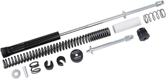 Caracteristicas: Asymmetrical design places a preload adjuster over a progressive rate spring in one leg and an aluminum-bodied, sealed cartridge damper on the other; providing superior damping and ride control combined with tunable preload and a new benchmark for high performance suspension Improves resistance to front brake dive, front end stability, cornering and bottoming control Adjustable to standard length or to lower the front end up to 1” Complete fork internal replacement kit No modification for forks required