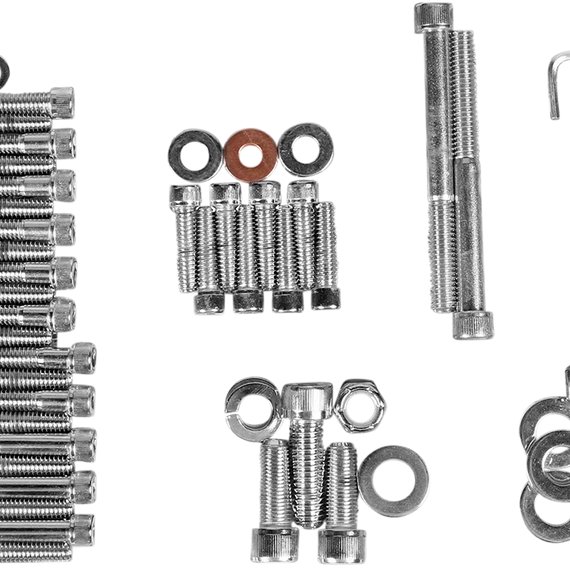 Caracteristicas: Socket-head bolt sets to meet virtually any custom need Complete motor sets for 07 and later Big Twin include bolts for primary, cam, cam sensor, derby, rocker box, transmission top, transmission side, lifter block and clutch covers Complete motor sets for 87-94 Big Twin include bolts for cam, primary, point, clutch, inspection and chain covers, lifter base, inner primary, top front and rear motor mounts, timing plug and header mount screws Complete motor sets for 04 and later XL include bolts for primary, cam, derby, lifter block, points cover, rocker box and engine case Complete motor sets for 86-03 XL include bolts for cam, primary, generator, sprocket, rocker box, top motor mount, lifter base, point or magneto cover Made in the U.S.A.