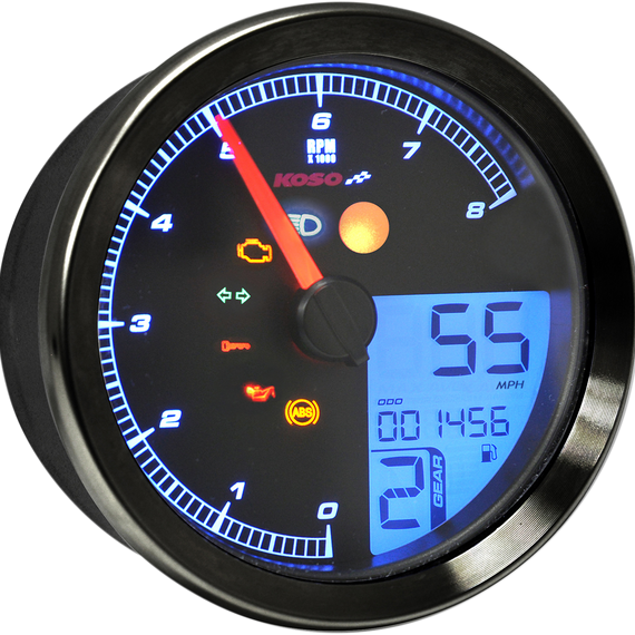 • Measures speed (0-225 mph/0-360 km/h), rpm, fuel meter, indicator lights and gear position