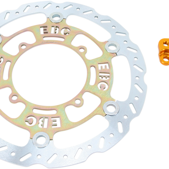 Caracteristicas: Super-trick looking contour brake rotor profile Heat-treated carbon steel construction has higher friction rating than stainless steel for added stopping power Rotor design reduces unsprung weight Luster gold-anodized finish prevents corrosion