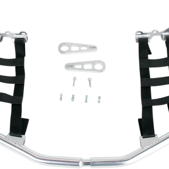 Caracteristicas: Manufactured from lightweight 1-1/4" extruded aluminum tubing Custom EZ-fit clamp brackets with silver anodized finish Wide 1-1/2" black webbing with beefy aluminum net tabs Sweep up from front to the rear for maximum ground clearance Maximum width of 50" to comply with ATVA rules Allows the use of OEM heel plate/fender extensions
