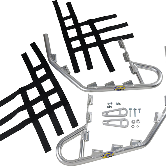 Caracteristicas: Manufactured from lightweight 1-1/4" extruded aluminum tubing Custom EZ-fit clamp brackets with silver anodized finish Wide 1-1/2" black webbing with beefy aluminum net tabs Sweep up from front to the rear for maximum ground clearance Maximum width of 50" to comply with ATVA rules Allows the use of OEM heel plate/fender extensions