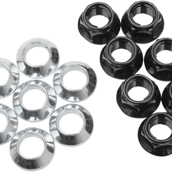 Caracteristicas: Designed to eliminate the troublesome problem of lugs that work their way loose, these kits include eight metal locking flange nuts and eight tapered adapter bushings Ideal for any wheel; fit either tapered or flat lugs Fit all full-size Japanese sport and utility ATVs