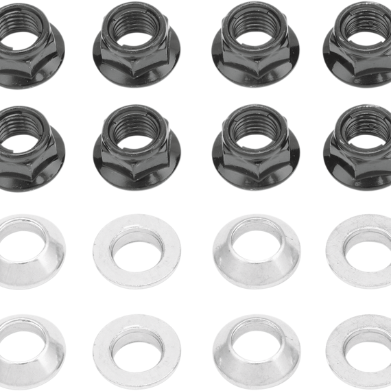 Caracteristicas: Designed to eliminate the troublesome problem of lugs that work their way loose, these kits include eight metal locking flange nuts and eight tapered adapter bushings Ideal for any wheel; fit either tapered or flat lugs Fit all full-size Japanese sport and utility ATVs