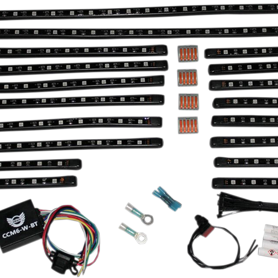 Caracteristicas: Encased in a flexible rubber housing, strips can stand up to the abuse your off road vehicle endures These light strips are water proof, weather proof, and can even take impacts from rocks and debris without damage All Magical Wizards™ come with 84” wire leads to make installation easier and are pre-taped with 3M™ adhesive tape for a durable installation 1 Complete Installation Kit which includes 3M Promoter, Push Button Switch, battery terminal connectors, 5 position Cage Clamp® connectors, dielectric grease, butt connectors, and tie wraps 1 Water Tight Color Command Bluetooth Remote 3/4" LED Spacing, 180 LEDs per kit, 120° viewing angle