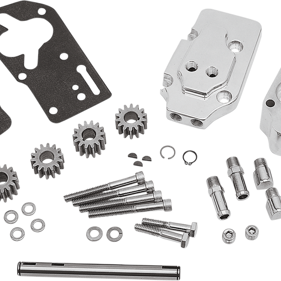 Caracteristicas: Constructed of high-quality billet aluminum with a polished finish Unique three-valve system delivers 8-10 lb. of oil pressure to the crankshaft at idle (all other oil pumps have a pressure valve that closes at idle, denying the crankshaft oil flow at idle) Stainless steel check valve eliminates wet sumping upon start-up; positively will not leak oil into the lower end during storage No provisions for primary or rear-chain oiling U.S. Patent #6,230,680