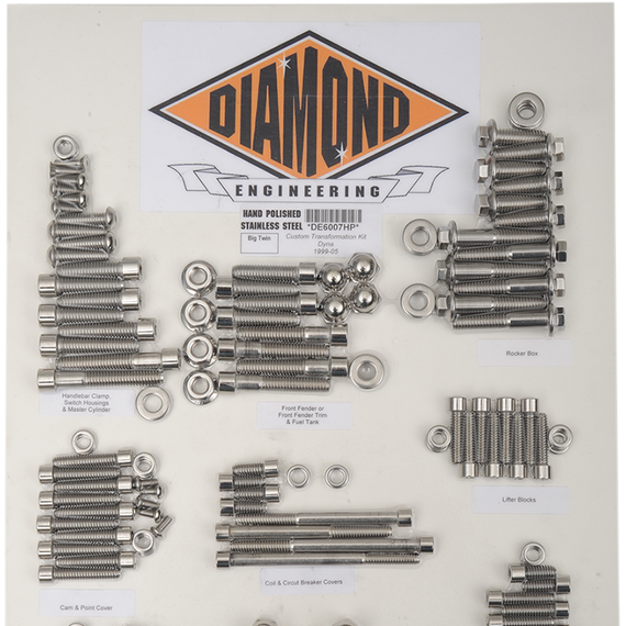 Caracteristicas: Customize a bike without having to completely disassemble it Groups of polished stainless steel fasteners covering the engine, transmission and the most visible areas of the motorcycle Kits add detail and a custom look with ease Kits include fasteners for primary, inspections and inner primary; cam and points; oil pump or oil line cover, filter mount and sensors (Dyna and Twin Cam FLHT) or oil filter plugs and sensors (Softail Twin Cam); lifter blocks; rocker box; coil and circuit breaker covers (Dyna); transmission side cover; oil filler (FLHT models); transmission top cover; handlebar clamp, switch housings and master cylinder; front fender or front fender trim and fuel tank (FLHT models); rear fender rail or swingarm pivot blocks and rear floorboard brackets (FLHT models) Made in the U.S.A.