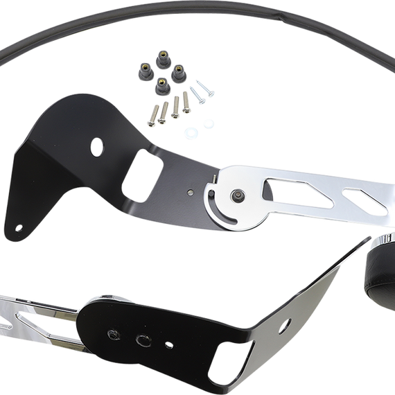 Caracteristicas: Chrome-plated, CNC-machined billet aluminum construction with padded and upholstered cushions Fully adjustable in both height and width for maximum comfort Arms pivot vertically to allow easy trunk access Hidden steel mounting plates fit directly behind passenger backrest Includes cup holder mounting bracket (cup holder not included)