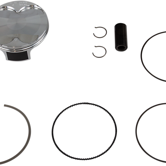 Caracteristicas: All pistons are heat treated with a T-5 hardening and tempering cycle All piston skirts are coated with a high-tech Molybdenum Disulphite coating for faster break-in time and increased piston life Cast piston kits are gravity cast aluminum alloy (not forged) with 18% silicone content, which produces an extremely light but very strong piston Forged pistons are forged from 2618 aluminum for superior strength and durability Forged High Compression pistons improve power and torque across entire rpm range Big Bore pistons increase engine’s displacement, torque, and peak horsepower Forged Replica pistons are forged OE replacements Replica pistons and all rings are OEM replacements Kit include piston, rings, wrist pin and circlips Replacement two-stroke piston rings sold individually; four-stroke piston rings sold as a set as needed Top End Kits include Piston Kit and a Top End Gasket Kit, top-end bearing and cam chain.