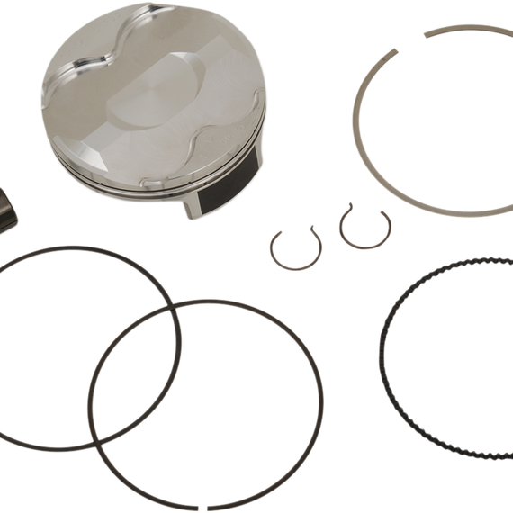 Caracteristicas: All pistons are heat treated with a T-5 hardening and tempering cycle All piston skirts are coated with a high-tech Molybdenum Disulphite coating for faster break-in time and increased piston life Cast piston kits are gravity cast aluminum alloy (not forged) with 18% silicone content, which produces an extremely light but very strong piston Forged pistons are forged from 2618 aluminum for superior strength and durability Forged High Compression pistons improve power and torque across entire rpm range Big Bore pistons increase engine’s displacement, torque, and peak horsepower Forged Replica pistons are forged OE replacements Replica pistons and all rings are OEM replacements Kit include piston, rings, wrist pin and circlips Replacement two-stroke piston rings sold individually; four-stroke piston rings sold as a set as needed Top End Kits include Piston Kit and a Top End Gasket Kit, top-end bearing and cam chain.