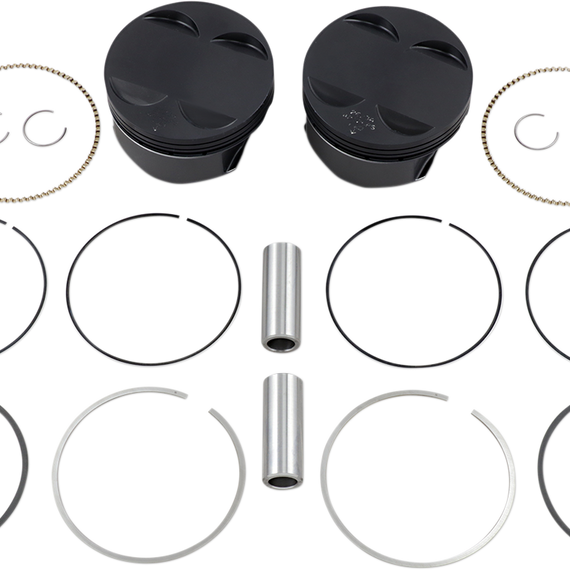 Caracteristicas: Feature ArmorX™ piston coating for superior protection in extreme conditions and reduced wear ArmorFit™ skirt coating auto-adjusts to the cylinder wall so there’s no need to measure clearance; provides smooth, quiet, trouble-free operation Dome design for improved flame travel to maximize air/ fuel burn efficiency High compression (11:1) for added power Superfinish piston pin reduces friction and improves scuff resistance Enhanced pin oiling for improved lubrication and reduced friction Augmented ring land details improve ring seal and function Dedicated rings for precise fit, improved compression and oil control Fit OEM and Screamin’ Eagle cylinder heads Kit includes two pistons, rings, piston pins and circlips Made in the U.S.A