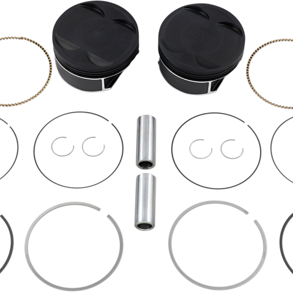 Caracteristicas: Feature ArmorX™ piston coating for superior protection in extreme conditions and reduced wear ArmorFit™ skirt coating auto-adjusts to the cylinder wall so there’s no need to measure clearance; provides smooth, quiet, trouble-free operation Dome design for improved flame travel to maximize air/ fuel burn efficiency High compression (11:1) for added power Superfinish piston pin reduces friction and improves scuff resistance Enhanced pin oiling for improved lubrication and reduced friction Augmented ring land details improve ring seal and function Dedicated rings for precise fit, improved compression and oil control Fit OEM and Screamin’ Eagle cylinder heads Kit includes two pistons, rings, piston pins and circlips Made in the U.S.A