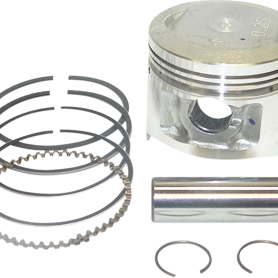 Caracteristicas: Quality and construction that meets or exceeds OEM Feature improved E-clip design Contain piston, rings, pin and clips Additional rings available separately Order one per cylinder Skirts have a nonabrasive, expansion-retarding MOS2 coating to reduce heat and friction for added power and longevity MOS2 coating actually draws heat through piston walls and out the bottom Specially hardened tops add strength to ring grooves