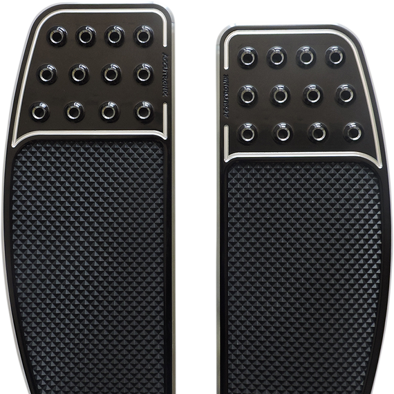 Caracteristicas: Replace the stock OEM front floorboards for a more custom look Machined with 6061 T-6 billet aluminum The top portion of the board has a raised hole feature inspired by racing pedals The lower area is a multi-directional, slip-resistant Machined Pyramid-Top Knurled design