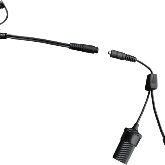 • Interior has a 5" long cable with female coax plug which can be hooked up to the Gears 1-into-2 male coax (included), which has a car-size female cigar plug on the other end for powering your devices like GPS, and an additional female coax plug output for connecting Gears heated clothing or Gears panel mount cable to throw power out from your luggage