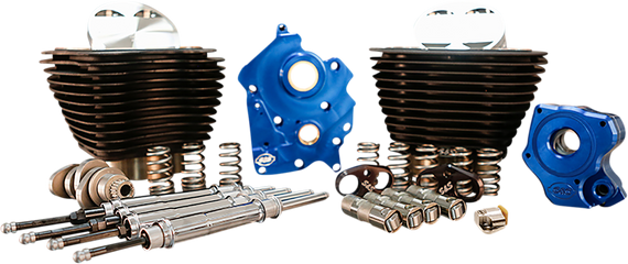 Caracteristicas: Big Bore Kit: Bolt on kit. No case machining required 4.250" bore Forged pistons 11.1: compression ratio Oil Pump/Cam Plate Precision machined from billet aluminum Passage plugs removable for servicing Independent scavenge sections for flywheel cavity and cam chest Debris screens in both scavenge pickups Magnet in cam chest to help to stop debris from entering oil pump Increased flow capacity on both feed and scavenge side Pressure Relief Valve is adjustable with unit installed in engine Pushrods: Quickee pushrods Tappets: S&S premium tappets Tappet Cuffs: Billet aluminum construction Stronger than stock material eliminates distortion Improve tappet stability in high lift and high rpm situations Cam: S&S 550 Cam- Designed for Big Bore applications Valve Springs: Work well with cams up to .605 lift High-performance conical single wire spring Made in the U.S.A.