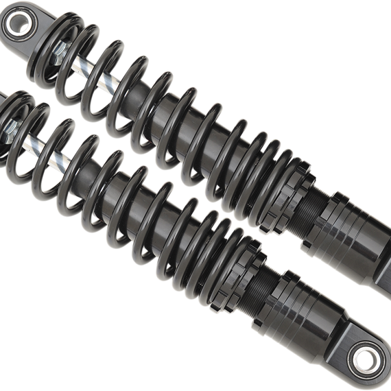 Caracteristicas: Nitrogen-charged steel monotube damper bodies with hard chrome-plated shafts Dual-rate progressive wound springs for a smooth, comfortable ride Adjustable spring preload Ride-height adjustable, +/- 1/2" from size listed Black shocks feature black springs and damper bodies with black end caps/eyelets Mount with existing hardware Shocks shorter than OE length have reduced travel, this may affect the ride quality and handling of the motorcycle. Lowering the motorcycle will reduce ground and cornering clearance. Before purchasing or attempting to install shocks that are different than the OEM length, confirm that your wheel travel can be altered without causing clearance issues such as swingarm/axle to exhaust contact, as well as chain/belt guard or tire contact. OE upper shock mount covers will not fit with these shocks. Not for use with rear lowering kits.