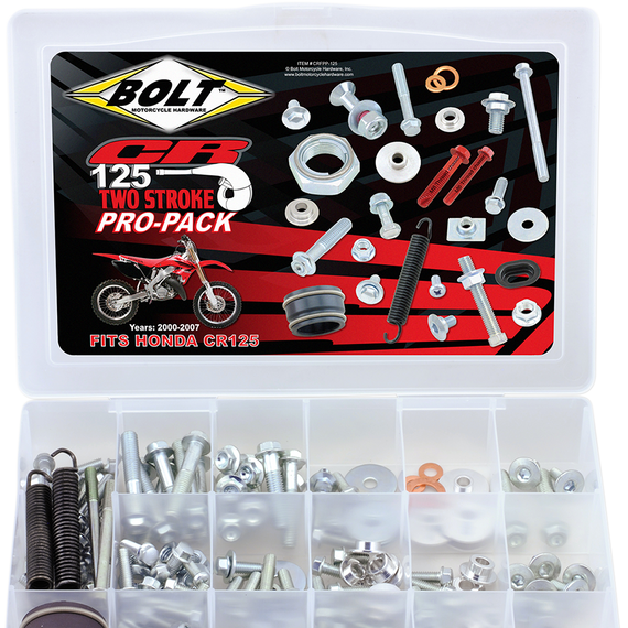 Caracteristicas: Includes complete fasteners and bushings for all bodywork, all outer case bolts, all cylinder and head fasteners, all swingarm hardware, triple clamp hardware, brake hardware, sprocket bolts, rotor bolts, rear axle nut, pipe springs, pipe silencer seal, drain plug washers, and Bolt's exclusive thread chasers.  All outer engine, chassis, and wheel hardware in factory style and finish for a complete CR125 and CR250 overhaul.