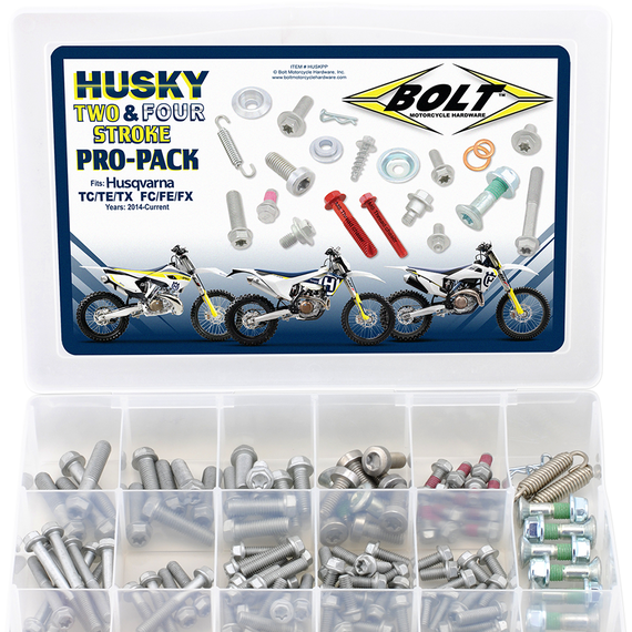 Caracteristicas: Husqvarna specific Pro-Pack designed for Husqvarna models 2014 to current two- and four-stroke models Contains hardware in factory style & finish including: shroud bolts, seat bolts, exhaust springs, sub-frame bolts, fork guard bolts, rotor bolts, a full set of sprocket bolts, factory style aluminum bushings, drain plug washers, and Bolt's exclusive thread chasers.