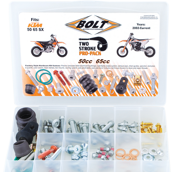 • Includes over 145 pieces of M6 and M8 dimpled flange bolts, concave washers, carb screws, shroud screws, sprocket bolts, Brembo style brake pin clips, three sizes of bushings, rim-lock spacers, drain plug washers, sub-frame bolts, M5 dimpled flange bolts, and valve stem grommets