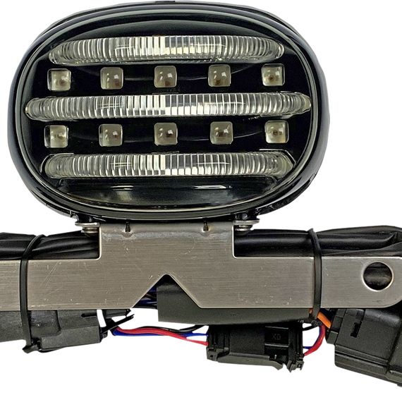 Caracteristicas: Three running LED light pipes illuminate across the taillight as a running light Ten full intensity brake LEDs to provide maximum safety and visibility Unit mounts with attached mounting bracket utilizing factory turn signal bar bolts with no drilling required Low-Profile design protrudes only two inches from the fender for a sleek custom look Simple plug and play solution to add a third brake light to the rear fender Provides increased side visibility to maximize safety