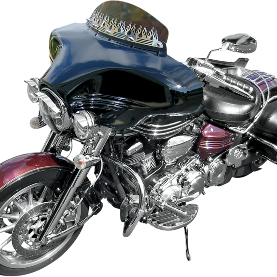 Caracteristicas: Specially designed to match the size, headlamp and lines that are unique to the Stratoliner Ball-milled recessed lines on the fairing front match the lines of the Stratoliner's gas tank Top-quality hand-laid fiberglass construction, gloss black gel-coated and ready to paint Comes with a Jensen JHD40BT stereo 3.5mm auxiliary input with detachable 3 ft. patchcord USB input port for memory stick devices 12V power socket for charging and operating accessories Stereo comes completely assembled with four 5" pre-wired speakers Concealed, internal antenna for a clean look Kit includes quick-release brackets to mount on OEM windshield docking points or accessory detachable windshield docking points Sirius capable Easy quick-detach connection to bike's electrical system Includes a 12" clear windshield Made in the U.S.A.