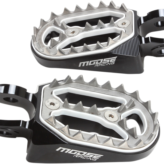 Caracteristicas: Two-piece light weight footpeg design CNC machined aluminum alloy construction Extra wide replaceable stainless steel footplate providing the rider with ultimate grip The stainless steel footplate also sits inside a rubber damper helping to absorb shock Use your OEM springs Available in black only