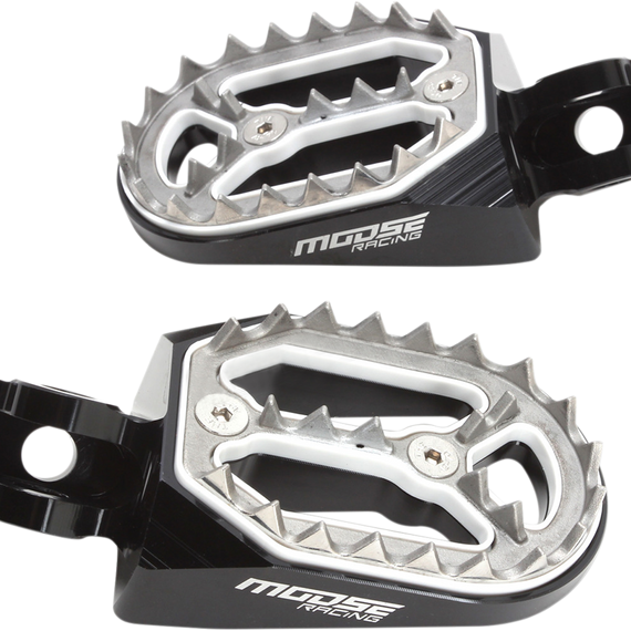 Caracteristicas: Two-piece light weight footpeg design CNC machined aluminum alloy construction Extra wide replaceable stainless steel footplate providing the rider with ultimate grip The stainless steel footplate also sits inside a rubber damper helping to absorb shock Use your OEM springs Available in black only