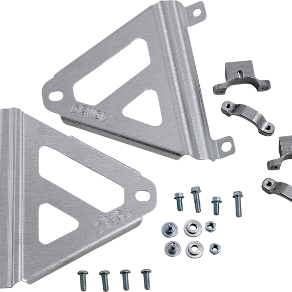 Caracteristicas: High-grade U.S. aluminum alloy CNC technology creates custom fit Mounts directly to frame/radiator Multi-point triangle design Simple installation Brushed aluminum finish Includes all hardware for easy installation 100% Made in the U.S.A.