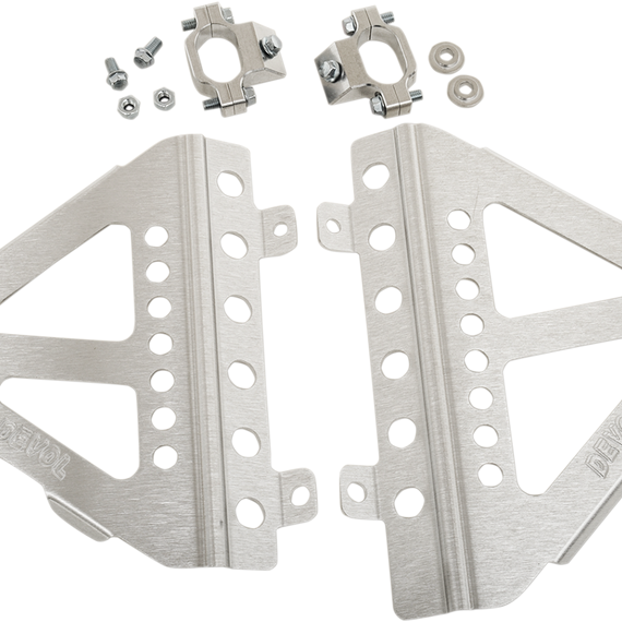 Caracteristicas: High-grade U.S. aluminum alloy CNC technology creates custom fit Mounts directly to frame/radiator Multi-point triangle design Simple installation Brushed aluminum finish Includes all hardware for easy installation 100% Made in the U.S.A.