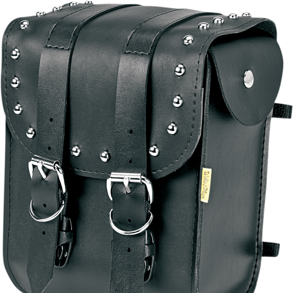 Caracteristicas: Black synthetic leather with easy tie-on mounting Accented with silver studs Quick-release buckles Convenient carry handle Plastic reinforced interior for shape retention 8" L x 10" H x 4½" W Made in the U.S.A.
