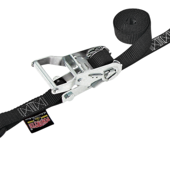 Caracteristicas: Heavy-duty vinyl-coated secure latch hooks Industrial-grade PowerTye ratchet 4,500-lb. test nylon webbing 700-lb. working load Double security stitching Made in the U.S.A.