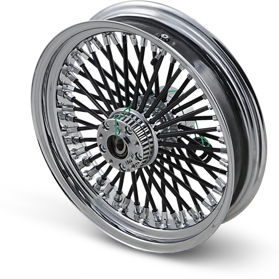 Caracteristicas: Chrome billet aluminum hubs with 3/8" stainless steel black spokes and chrome cold rolled steel nipples Wheels are sealed for most applications so that tubeless tires can be used (except 21" x 2.15" wheels) Wheels come completely assembled and are trued to less than .005" runout Radially-laced design gives the wheels a very unique look Made in the U.S.A. by RideWright Wheels Chrome conventional-style steel rim It is the installer's responsibility to determine the required changes.