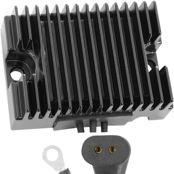 Caracteristicas: High-reliability voltage regulators feature rugged aluminum alloy construction and are available in Drag's chrome finish All provide accurately regulated voltage under all electrical loads, have no relay contacts to wear or become maladjusted and are environmentally sealed for protection against moisture and shock