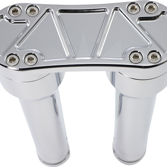 Caracteristicas: Bandit risers fit 1-1/8” ProTaper style handlebars on standard Harleys and many metric bikes The uniquely designed 8-bolt common top clamp keep the handle bars secure Risers are drilled for internal wiring and are tapped for ½”-13 mounting bolts These risers are machined from 6061-T6 billet aluminum Made in the U.S.A.