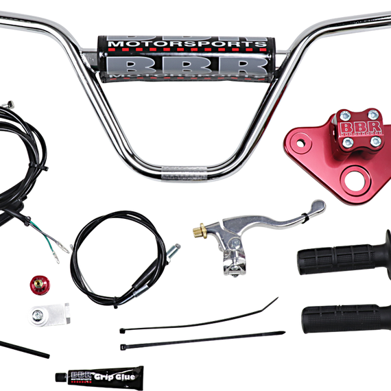 • Includes billet triple clamp, 8" rise handlebars, cable set throttle assembly brake lever, kill switch, bar pad, grips, carb top, 6mm Allen wrench and grip glue