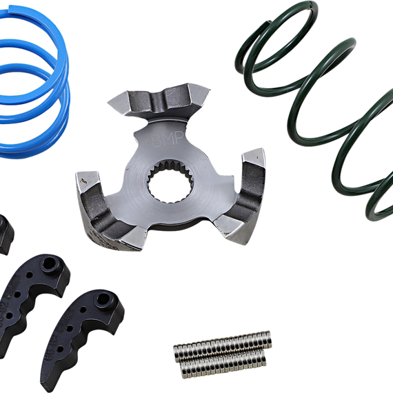 Caracteristicas: For Big tire RZR's Gain top speed over the stock clutching Much better power transfer than the stock weights Springs hold much better tension on the belt than factory Quicker back shifting when off the throttle More responsive feel Less belt slip resulting in longer belt life Longer clutch life Kit Includes: BMP magnetic adjustable weights, BMP Helix, BMP primary spring, BMP secondary spring & a setup guideline