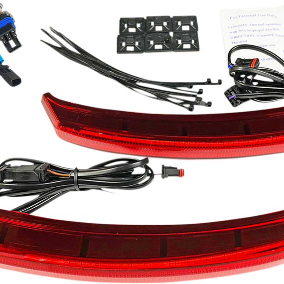 Caracteristicas: Super bright red LEDs provide contrasting red running light with full intensity brake and turn signal Include run/brake/turn functionality Pre-taped for mounting under the lid of the OEM saddlebag Quick disconnect for quick removal of saddlebags Plug and play wiring adapter for easy install