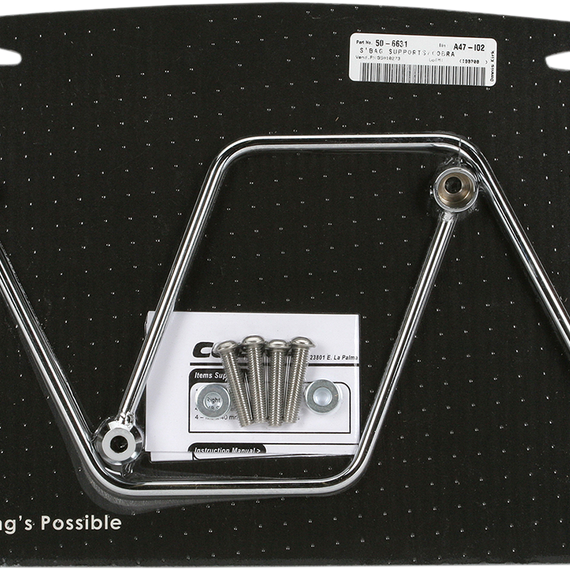 Caracteristicas: Keep throw-over saddlebags from getting tangled in the rear wheel Attach to existing mounting points for easy installation; custom-fit to each bike Made of thick steel tubing bent to fit each bike model and then polished and powder coated Safety feature for riders and saddlebags alike Made in the U.S.A.