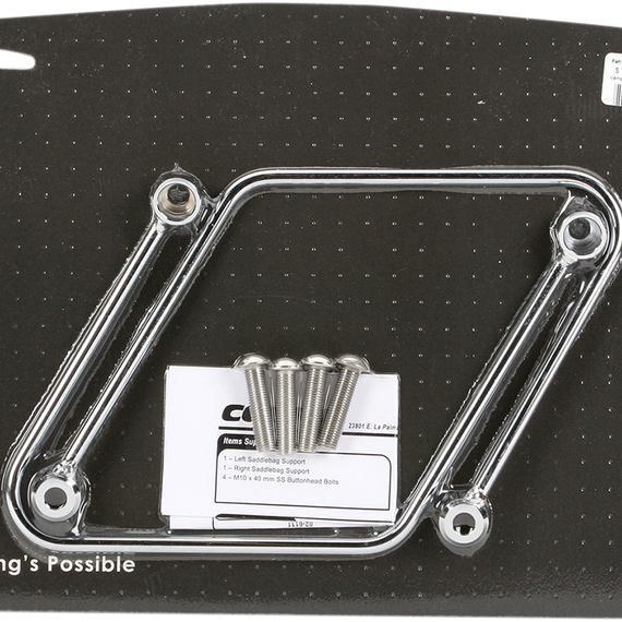 Caracteristicas: Keep throw-over saddlebags from getting tangled in the rear wheel Attach to existing mounting points for easy installation; custom-fit to each bike Made of thick steel tubing bent to fit each bike model and then polished and powder coated Safety feature for riders and saddlebags alike Made in the U.S.A.
