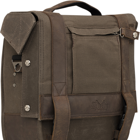 Caracteristicas: Detachable Saddlebag is black CORDURA and leather paneling for support that will age and show character over time A durable metal and polyethylene reinforced internal frame helps the bag keep shape whether it is empty or packed to the brim The roll top Closure and Snap/Velcro Road Shield system keeps the wind and elements out High quality “moto centric” speed buckles and zippers with metal Burly embossed button snaps and accents as well as an “Anti-Flail Snap System” keep everything secure Quick release pin-lock bracket system allows the saddlebag to be easily and quickly removed to be converted into a dual purpose messenger