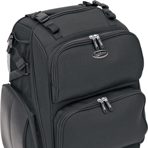 Caracteristicas: Smooth-rolling wheels and retractable handle make this bag perfect for airline travel Fully adjustable sissy bar mounting system goes on in seconds over any size and style sissy bar pad; once adjusted for your size pad, you never need to adjust it again Rigid construction holds bag shape even when empty Top cargo straps for attaching Saddlemen roll bag (sold separately) or for strapping on your jacket, rain gear, etc. Top pocket office organizer and lockable zipper pulls Built-in pocket with raincover Constructed of UV-, water- and weather-resistant 1200-denier SaddleTuff™ and leather-like, maintenance-free SaddleHyde™ panels Dimensions: 18" W x 21" H x 11.5" D; measures 2,600 cubic inches