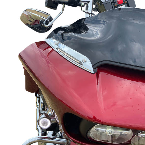 Caracteristicas: Bolts on to the stock Road Glide fairing to increase forward and side visibility with built in white DRL running light and sequential amber turn signals behind a smoked lens White DRL LEDs are automatically deactivated when the turn signal lamp or hazard warning lamp is activated, and automatically reactivated when the turn signal lamp or hazard warning lamp is deactivated Plug and Play installation with no additional modules required.