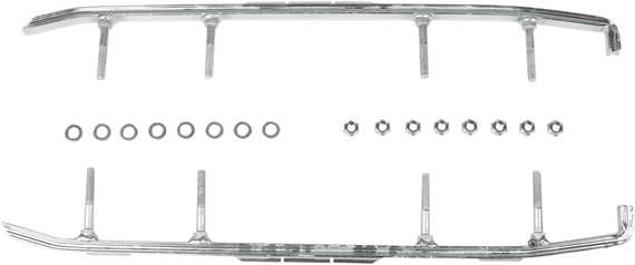 Caracteristicas: The first major breakthrough in wear bar technology since the 1950s Unique corner-carving hourglass design yields better control at speed with no increased steering effort Better tracking on trails - hourglass wear bar shape catches snow from ski sides to make steering more positive Average of 1' - 2' tighter turning radius in soft snow conditions 20% lighter than conventional 1/2" diameter round wear bars Zinc-plated for corrosion resistance Lifetime wear rate is nearly equal to current round and square wear bar types Manufactured by Stud Boy Designed and tested by USI Some models require drilling extra holes in the skis.