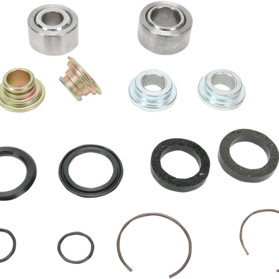 Caracteristicas: Kit contains two PTFE spherical bearings (cup bearings when used), four seals and related components Each shock kit rebuilds both ends of the shock absorber Some shock absorbers on Kawasaki and Honda models use a clevis to connect shock to the linkage. The bearing, collar and seals that are pressed into the linkage arm are included in the Pivot Works Shock Kit.